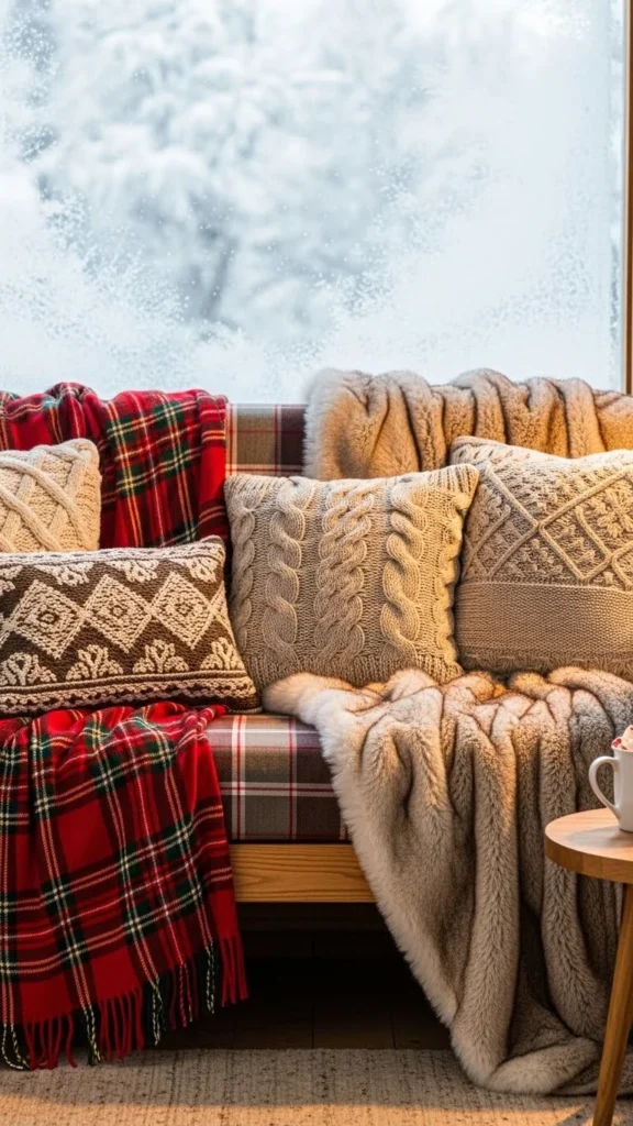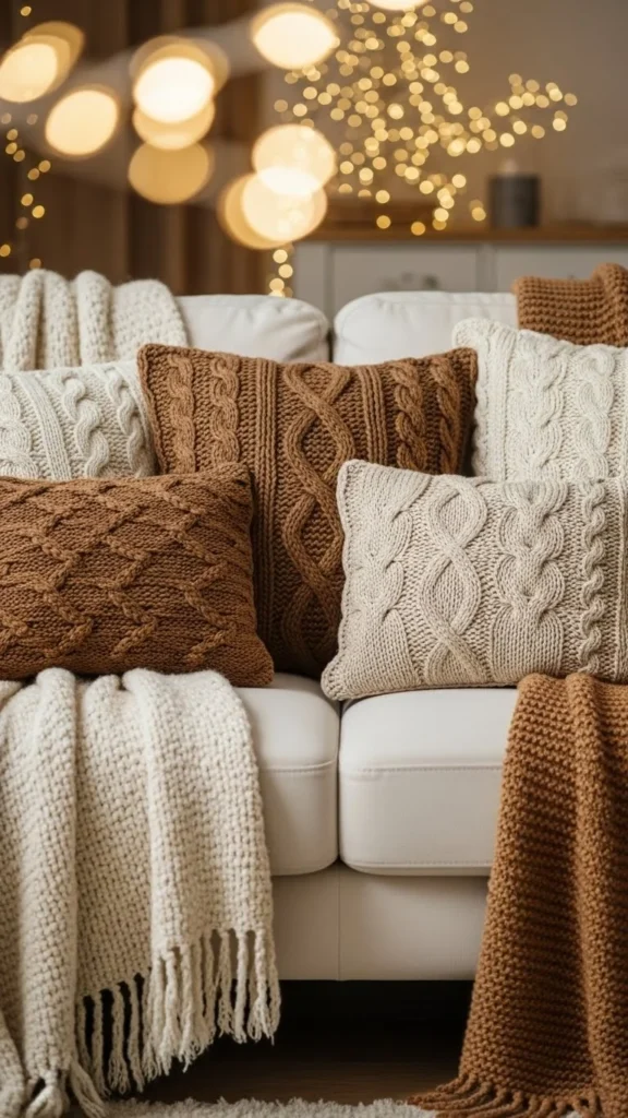 Knitted pillows add warmth and texture. Look for cable-knit or waffle patterns in earthy shades. If you already have pillows, buy inexpensive covers instead of new pillows. Mix knits with plaids or faux fur for added comfort. This detail makes your Christmas setup look relaxed and inviting.