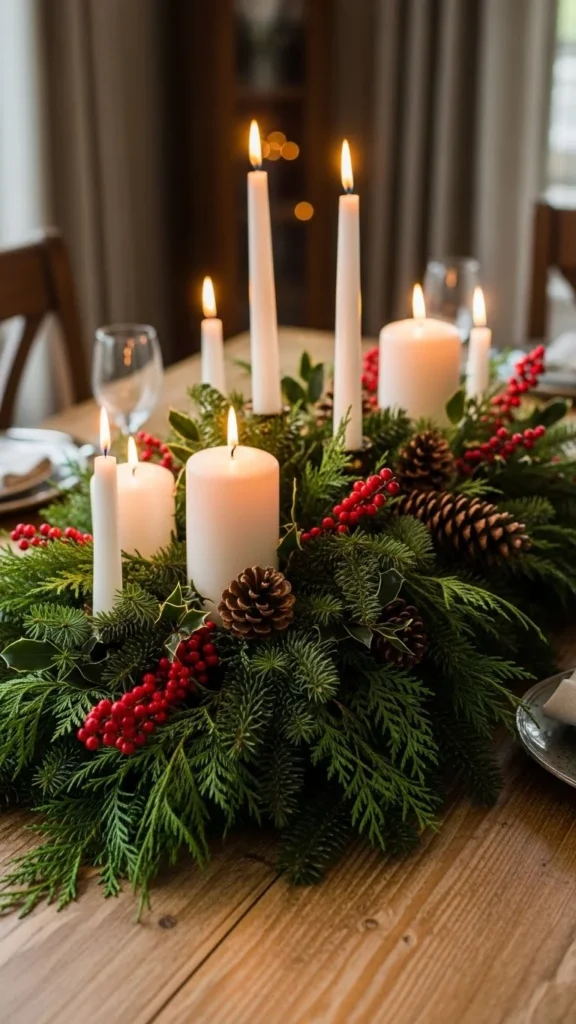 A nature-inspired centerpiece makes your dining table feel warm and inviting. Use fresh or faux evergreens arranged loosely along the center. Add pinecones, berries, and a few tall candles for height. Keep the look simple rather than polished. You can build it using trimmings from your yard, making it affordable yet beautiful. This setup creates a calm setting for holiday meals.
