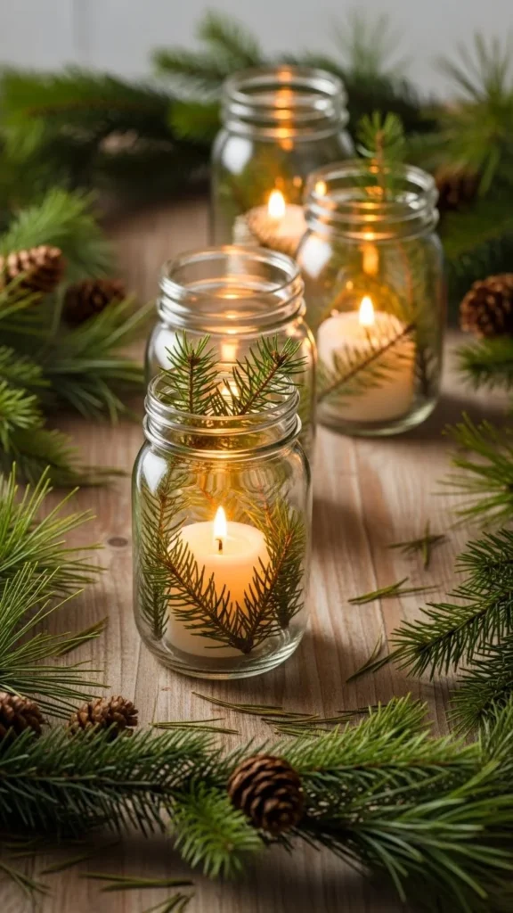 Mason jars make budget-friendly decor that fits the cabin style. Fill them with candles, fairy lights, or small evergreens. Wrap twine around the top for a rustic touch. Place them on shelves, mantels, or kitchen counters. You can also group different jar sizes together for variety. They create soft lighting that complements wooden surroundings.