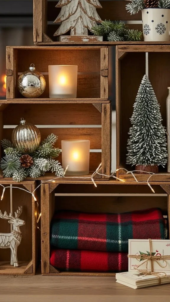 Repurpose wooden crates as shelving units for your Christmas setup. Use them to display ornaments, books, blankets, or small decor pieces. Place them horizontally or vertically depending on the space. This idea is practical and adds character. Crates can also hold extra firewood near the fireplace, blending utility with style.