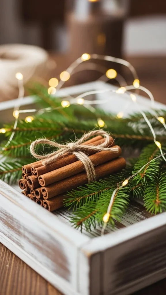 Cinnamon bundles add natural fragrance and a warm visual element. Tie a few sticks together with twine and place them around the room. Put them in bowls, trays, or on your mantel. You can also add dried oranges for extra charm. These tiny pieces help fill gaps in your holiday decor without spending much money.