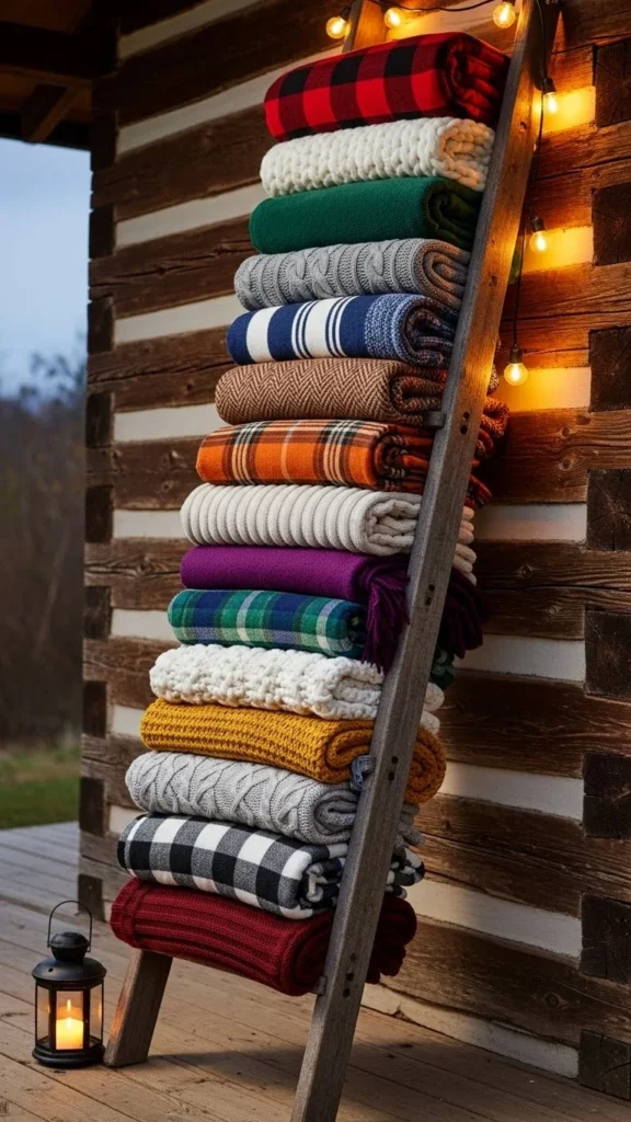 A simple wooden ladder can display blankets in a charming way. Lean it against the wall and layer your throws neatly. You can find old ladders in thrift shops or build one using inexpensive wood. Choose blankets that fit your Christmas palette to keep the look cohesive.