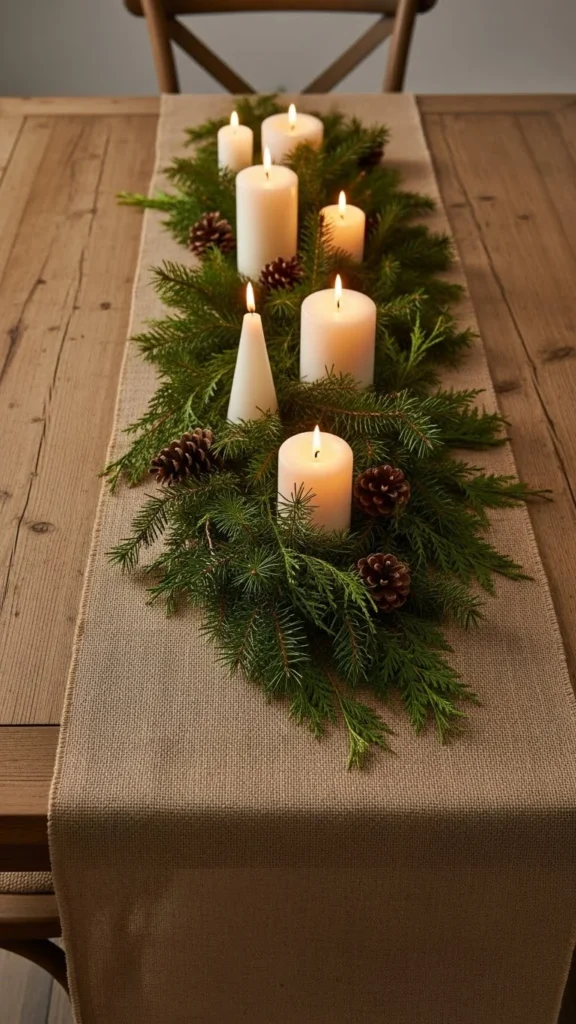 A simple table runner grounds your holiday tablescape. Choose burlap, linen, or thick woven cotton. Keep it neutral so your greenery and candles stand out. You can also stencil simple shapes like stars or trees on the ends for a DIY touch. This creates a warm, inviting base for holiday meals.