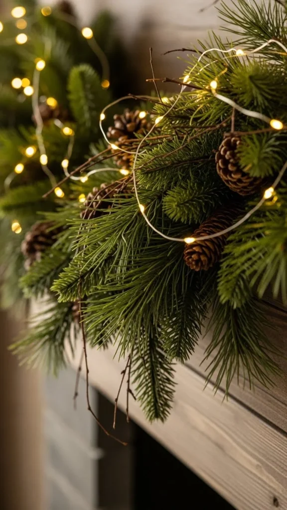 A rustic cabin transforms beautifully with a woodland garland. Start with faux pine branches if natural ones aren’t available. Weave in pinecones, dried oranges, cinnamon sticks, or small wooden ornaments. Keep the overall look organic. You don’t need perfect symmetry. Add warm fairy lights to highlight the natural textures. If you want a simple DIY touch, gather small branches from your yard, spray them lightly with matte snow spray, and tuck them into the garland. The mix of textures creates a grounded holiday atmosphere. This works well over mantels, windows, door frames, or bookshelf edges.