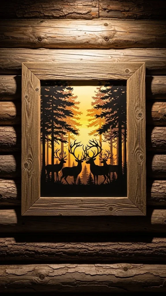 Nature-themed art brings a cabin feel to your walls. Pick simple wooden frames and fill them with silhouettes, pressed leaves, or minimal winter prints. You can create your own art using kraft paper and stencils. This keeps costs low while adding personality.