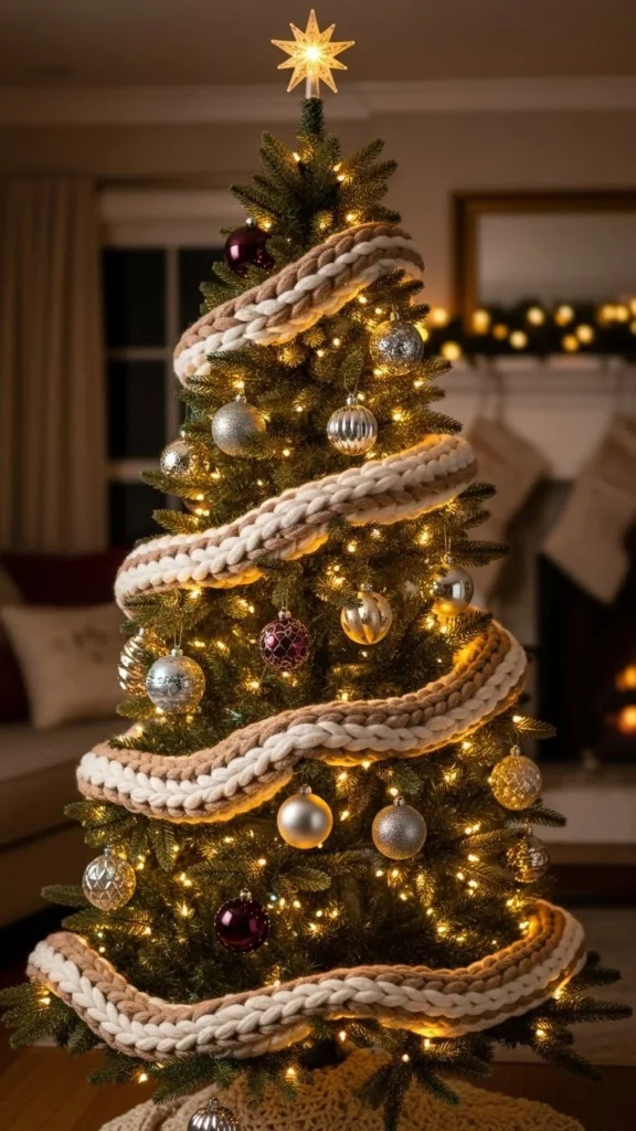 A chunky knit garland gives your tree soft depth. Choose cream or beige for a classic winter look. You can also knit your own using thick yarn. Wrap it loosely so it drapes naturally. It pairs beautifully with wood ornaments and warm lighting.