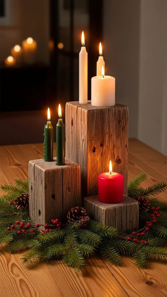 Reclaimed wood pieces make great candle holders. Cut wood into square or rectangular blocks, drill holes for candles, and sand lightly. Keep the finish raw for an authentic look. Group several sizes together on tables or shelves. Add greenery around the base for softness.