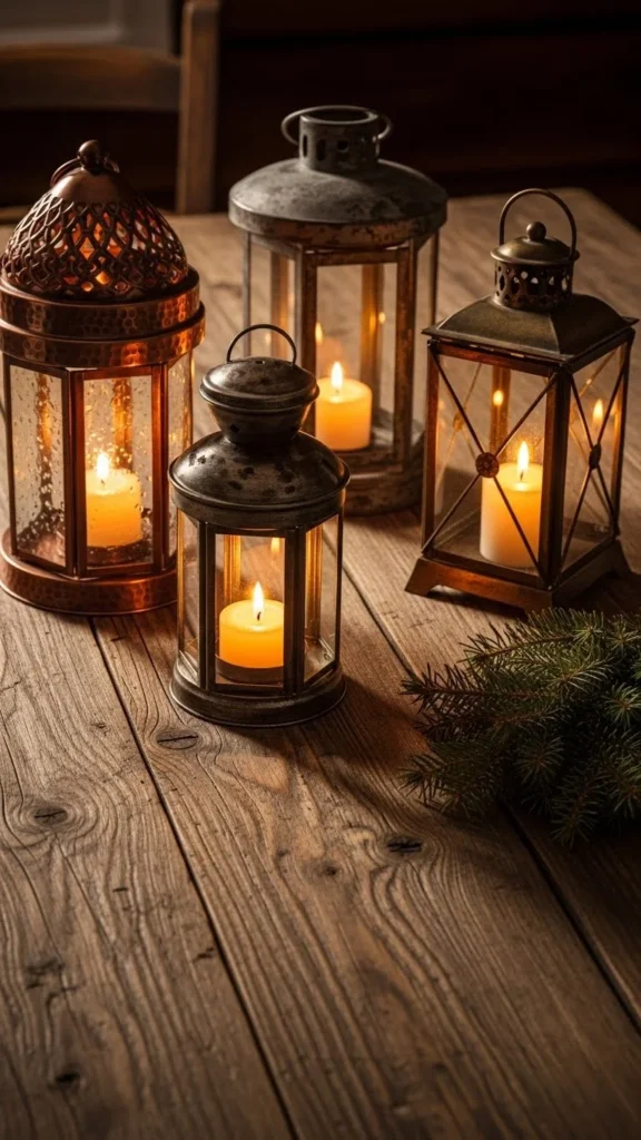 Old lanterns instantly set the tone for a rustic Christmas. Place them on mantels, coffee tables, kitchen counters, or porch steps. Add LED candles if you prefer something safer, but choose ones with a warm flame-like glow. Mix lantern sizes for a collected look. You can even repurpose thrift-store lanterns by brushing them with a little matte black or bronze paint. Add small pine sprigs or a bit of twine around the handle to tie them into the holiday theme. Their glow works beautifully alongside wood textures and holiday greenery.