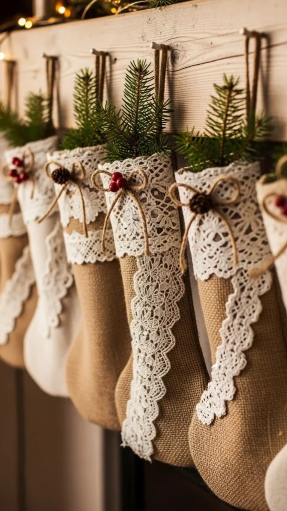 Burlap stockings bring old-fashioned charm to cabin decor. They look handmade and suit a natural Christmas style. Buy simple ones or make your own using cheap burlap fabric. Add touches like lace, plaid ribbon, wooden buttons, or sprigs of greenery. Hang them from nails or rustic metal hooks for added charm. Burlap works best when paired with warm lighting and pine garlands. This little detail adds character without overwhelming the room.