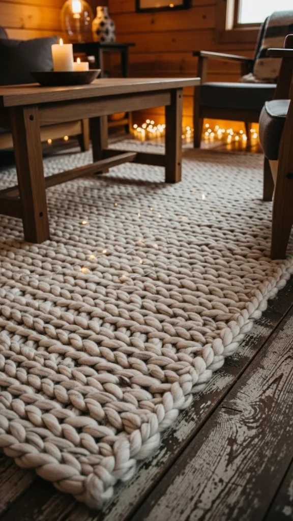 A wool rug adds warmth underfoot and visually anchors your holiday setup. Choose earthy tones like cream, charcoal, or deep red. Look for woven or braided styles that match the rustic theme. If you’re on a budget, place a smaller rug layered on top of a neutral base rug to create the same effect. Rugs work well in living rooms, near the tree, or by the fireplace. This small change adds comfort and softens the look of wooden floors.
