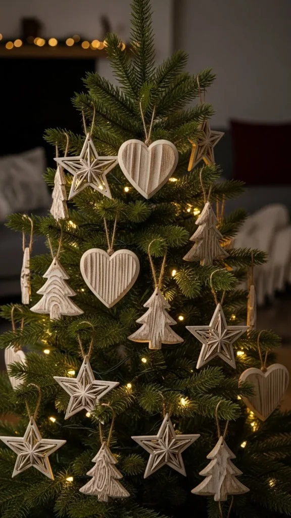 Wooden ornaments add warmth to your Christmas tree. You can buy them or make your own using thin wood slices or small craft shapes. Add twine loops, paint simple patterns, or leave them bare for a raw, natural look. Mix them with pinecones, berries, and linen ribbon for a relaxed style. Wooden ornaments pair well with trees that have warm white lights instead of bright white or multi-colored bulbs.