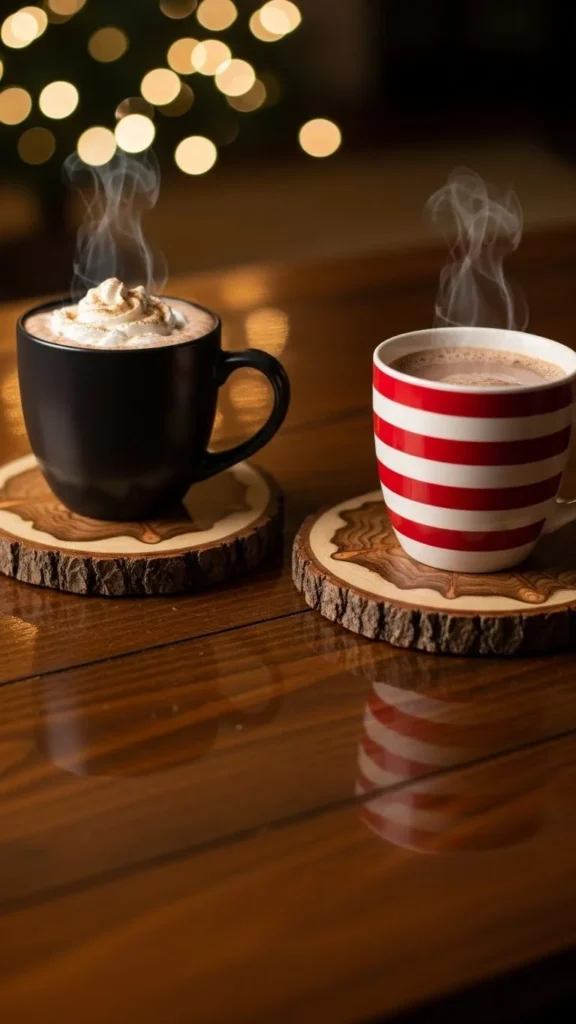 Wood slice coasters are simple and practical. They fit perfectly with a rustic holiday theme. Buy pre-cut slices or make them by cutting branches into thin discs. Sand the edges and add a matte sealant if you want to protect them from moisture. They’re excellent for holding holiday drinks and also double as decor. Put them on trays, coffee tables, or beside snack stations.