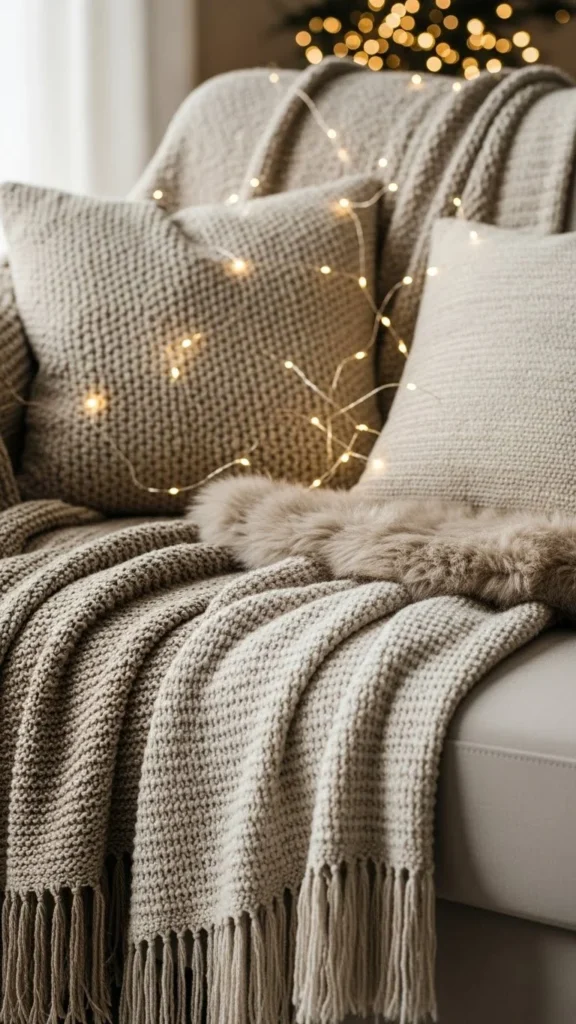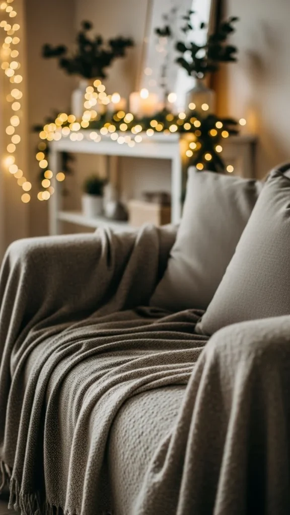 For budget-friendly styling, shop local markets or reuse older blankets by pairing them with holiday pillows. A DIY trick is to wrap an ordinary throw with a thin satin ribbon tied loosely at the corner. This adds polish instantly. Keep the tones light so the space feels calm even with other décor pieces around.