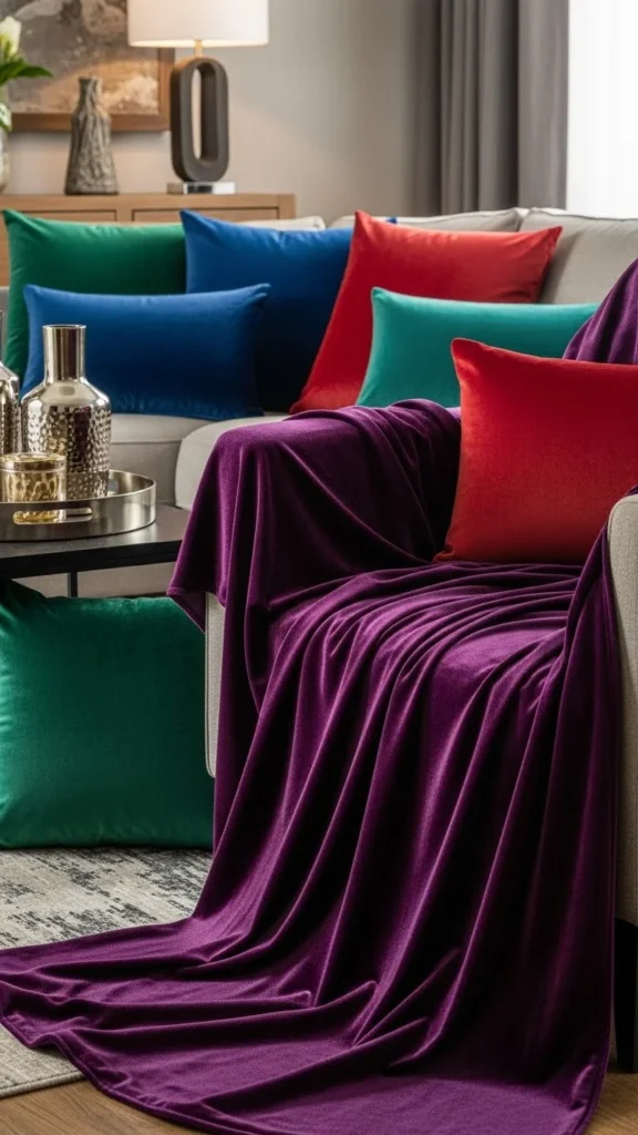For a budget-friendly idea, buy small velvet fabric pieces and sew simple covers for existing pillows. You can also drape velvet over a basket or side table for a soft accent. The material makes the room feel cozy without adding clutter.