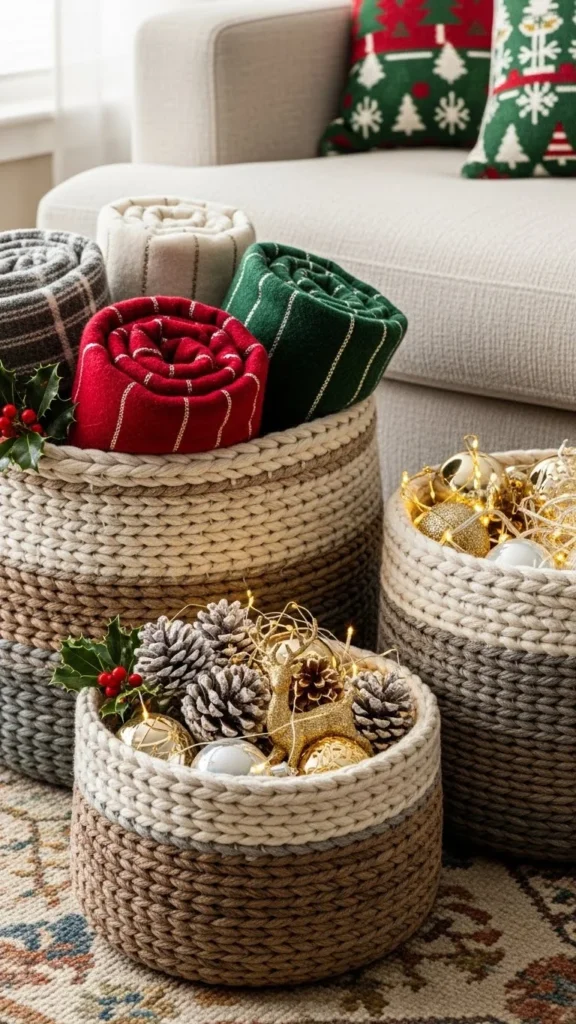 Baskets keep your space tidy while adding natural texture. Use woven options in tan or dark brown. Fill them with blankets, extra pillows, or holiday books.