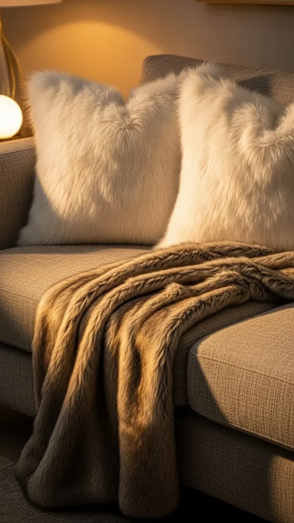 Faux fur instantly makes your living room feel cozy. Add one fur pillow or drape a small throw over an armchair. Keep the tones soft—ivory, beige, or gray—to avoid overwhelming the space.