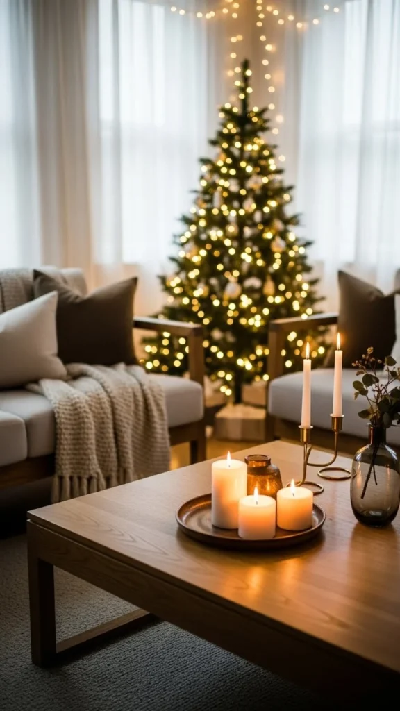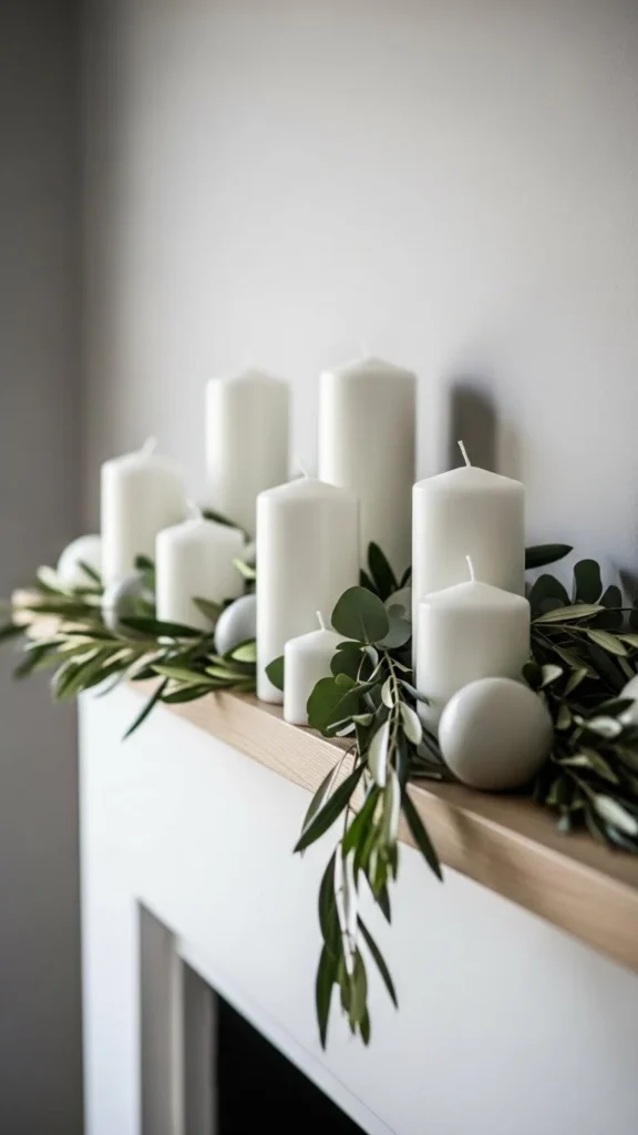 Candles add warmth and calm to your living room. Arrange three to five pillar candles of different heights on a tray or low dish. Add a few pine sprigs around the base for texture. Keep the layout simple to avoid clutter.