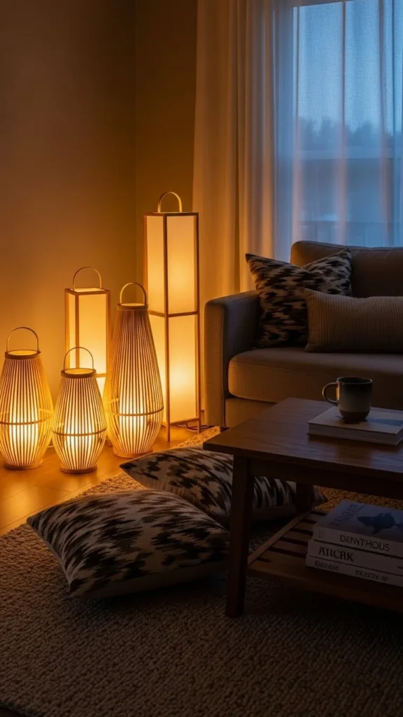 Floor lighting adds subtle ambience. Use lanterns, soft-glow lamps, or LED candles near the base of furniture. This creates warm, low-level light that feels welcoming at night.