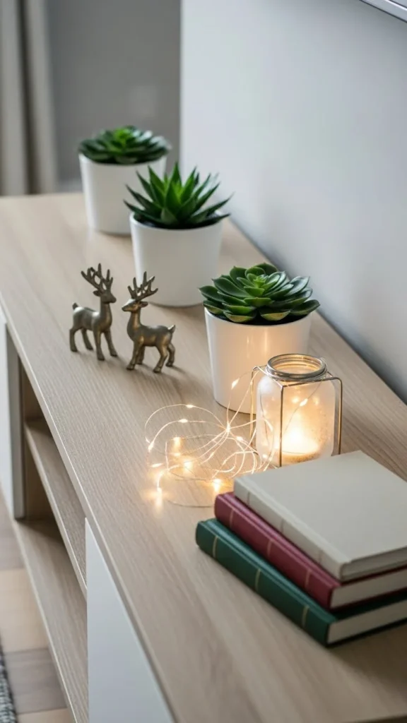 Bookshelves can look festive without becoming overwhelming. Swap a few everyday pieces for small ornaments, mini trees, or soft-lit candles. Keep plenty of open space so the arrangement feels airy.