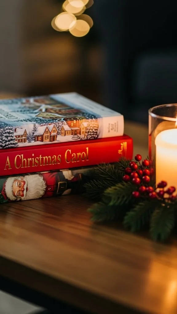 Books bring personality to your living room. Stack two or three seasonal books on your coffee table or side table. Add a candle or ornament on top for a styled look.