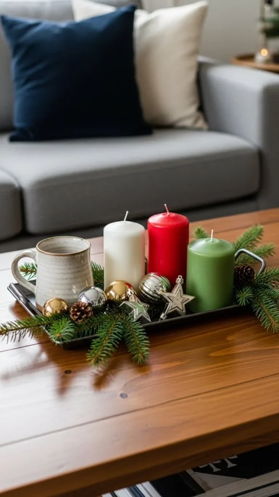 A curated tray keeps your living room organized while still allowing seasonal personality. Use a round or rectangular tray that fits your table shape. Add two or three items like a candle, a small vase with pine sprigs, and a couple of ornaments. The setup looks intentional without being busy.