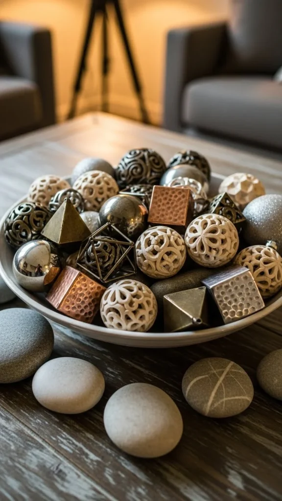 You can spray-paint old ornaments to create a uniform set. Use one large bowl or several smaller dishes placed around the room. This adds subtle charm without cluttering surfaces.