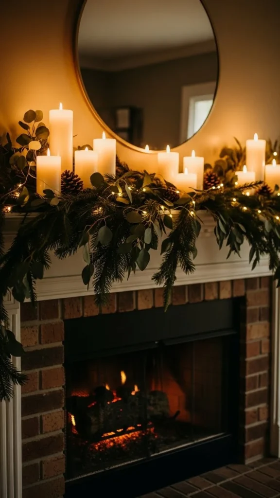 Your mantel sets the tone for the rest of the room. Add candles, garlands, and a small decorative bowl with ornaments. Keep the layout simple and balanced.