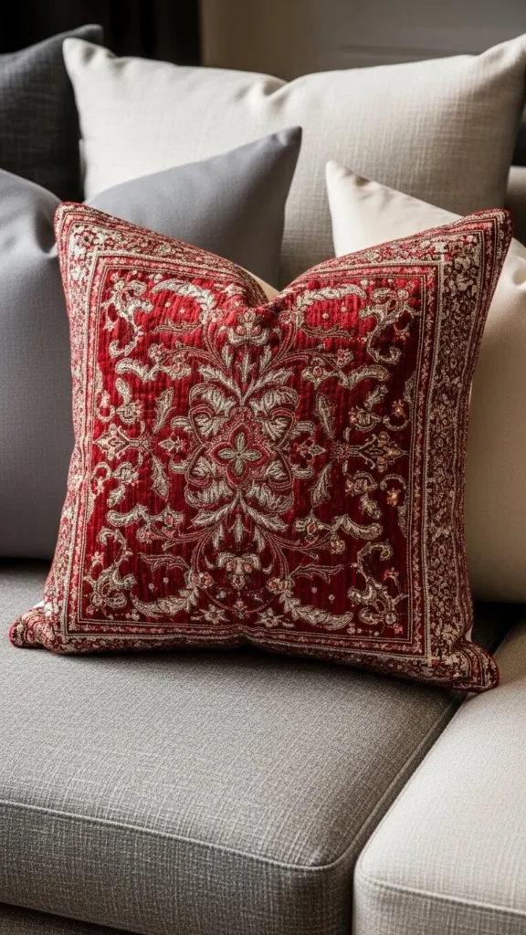 To keep it affordable, cover existing pillows with seasonal cases instead of buying new inserts. Look for zipper covers online or create a simple one using leftover fabric. If red or green feels too intense, choose soft metallics like champagne or silver. This adds subtle charm without overwhelming your theme.
