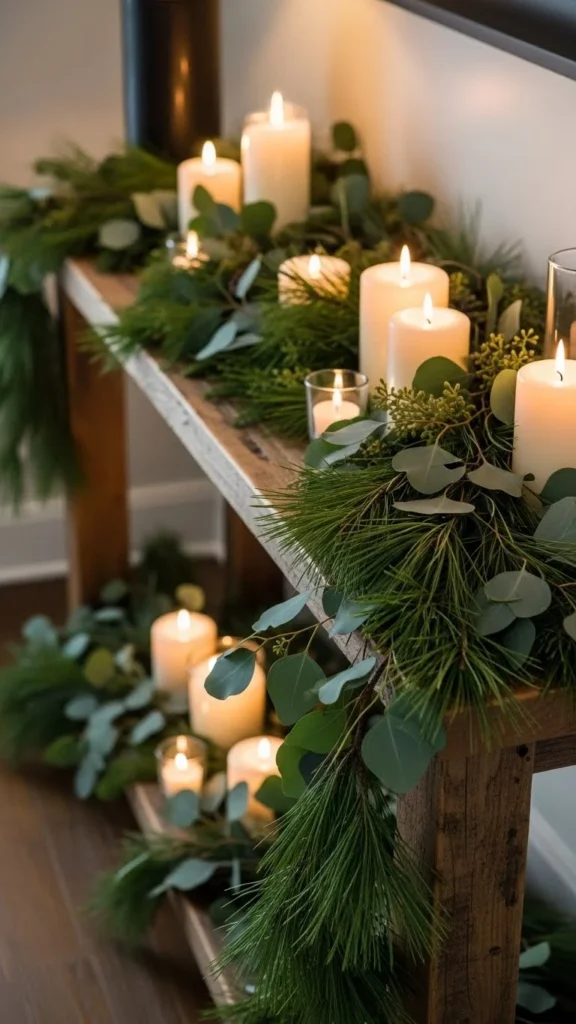 Greenery instantly gives your space a holiday feel. Add garlands to mantels, TV stands, or bookshelves. Mix pine with eucalyptus for a fuller look. Keep the arrangement low for easy styling and cleaning.