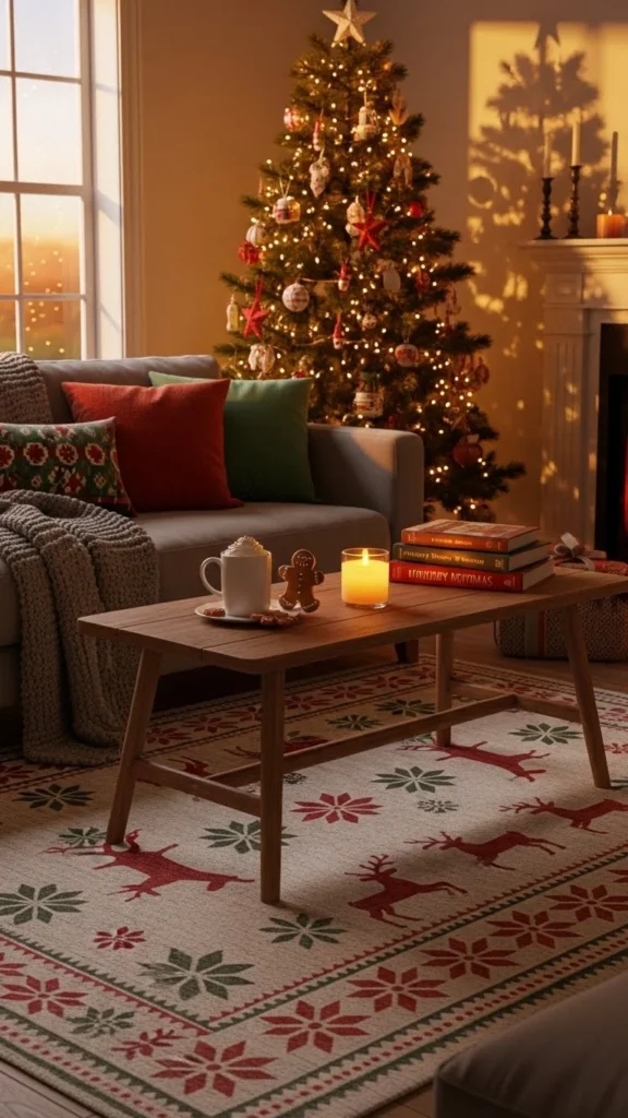 To stay within budget, try washable rugs or seasonal covers that sit on top of your main rug. This protects your flooring while adding holiday style. You can also layer a small faux-fur rug in front of the sofa or fireplace for a textured winter look.