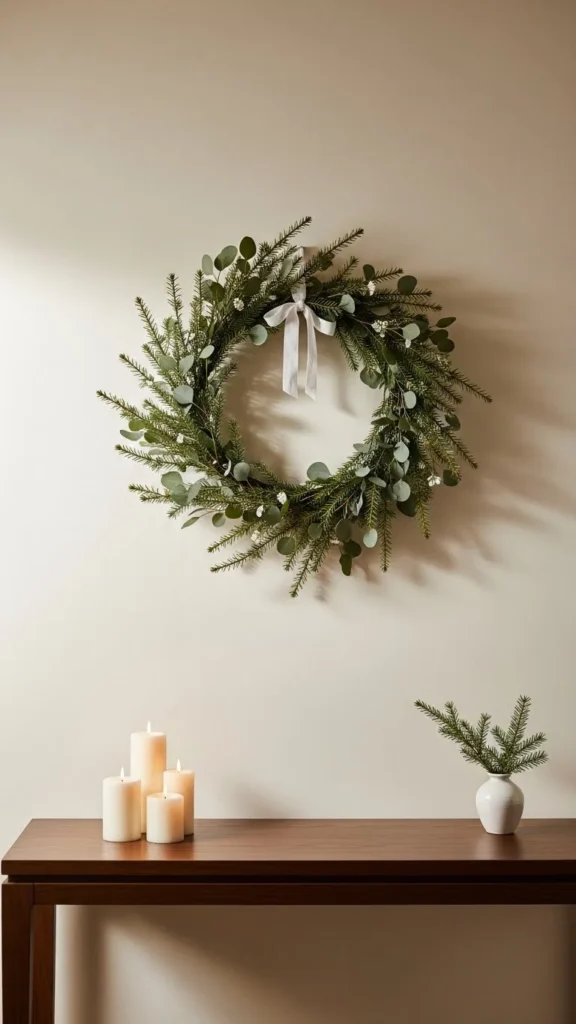 A wreath indoors feels charming and unexpected. Hang one above your sofa, console, or fireplace. Choose a simple design with eucalyptus, pine, or mixed greenery. Keep the ribbon neutral for a clean look.