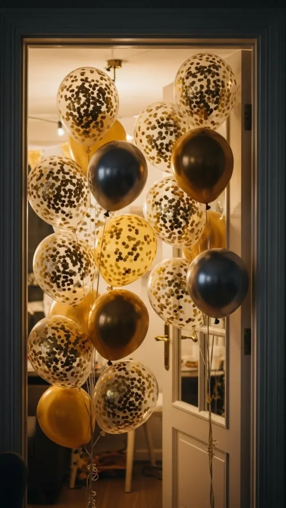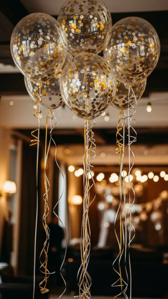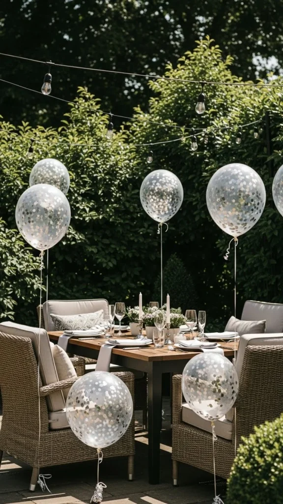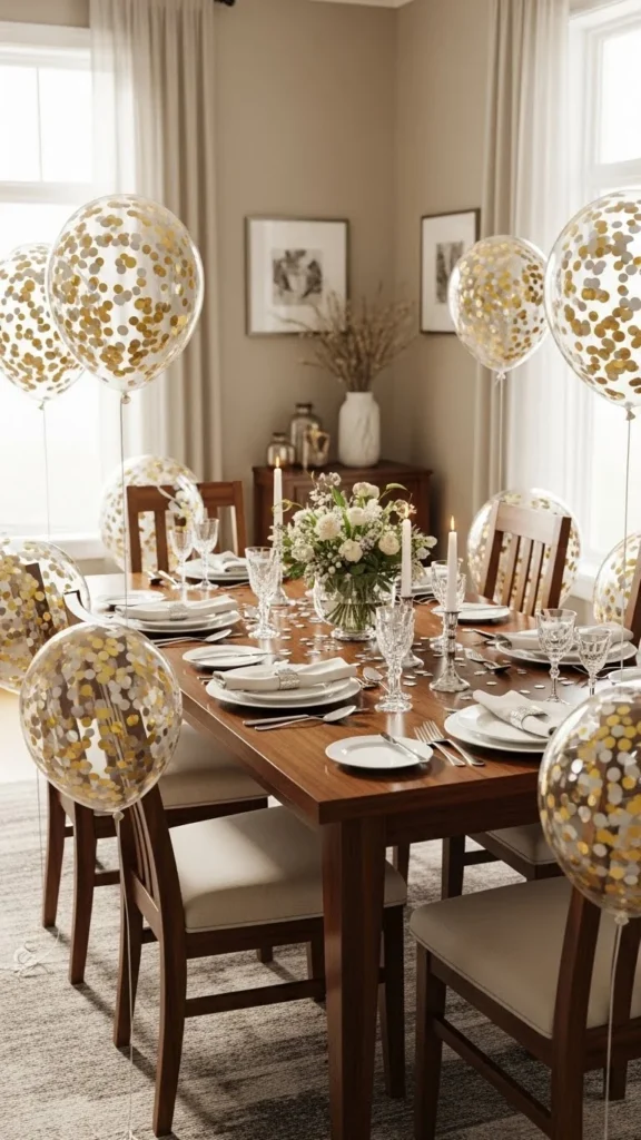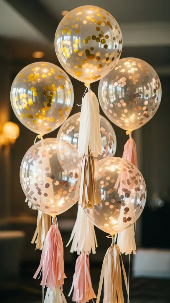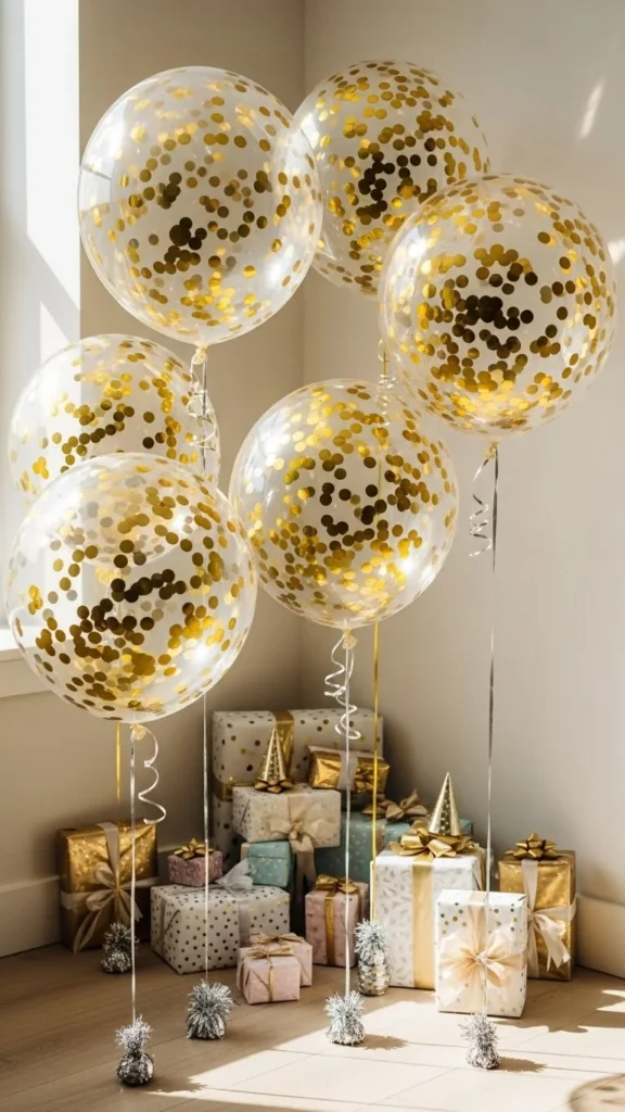 Metallic confetti balloons shine best in evening light. They catch reflections from lamps and string lights, adding depth to the room.