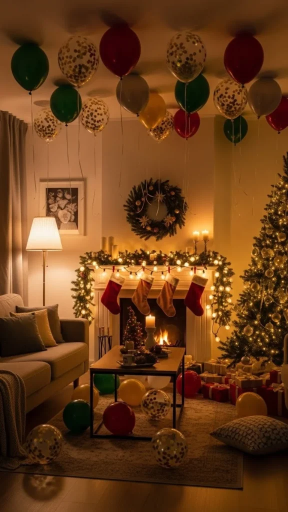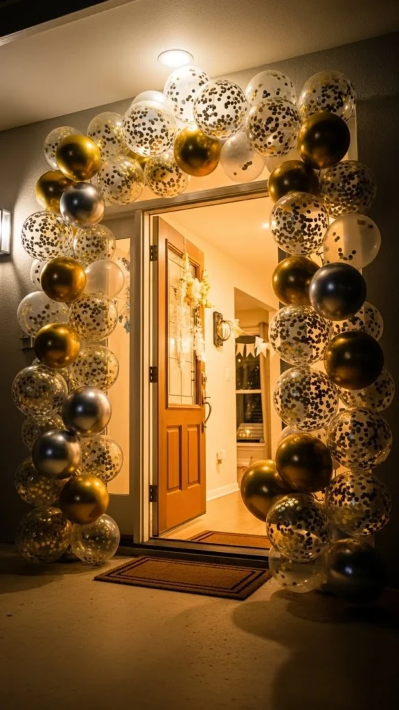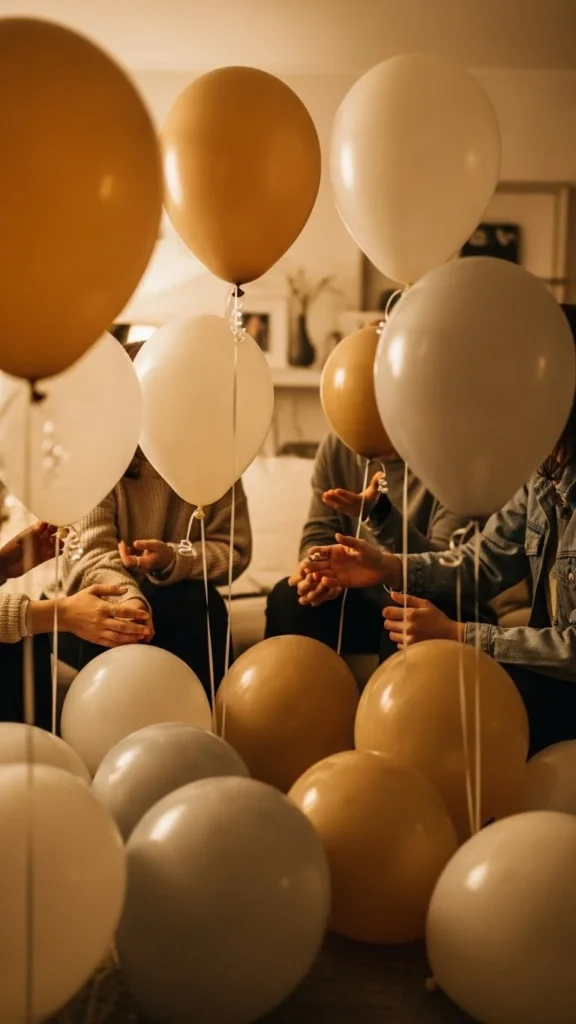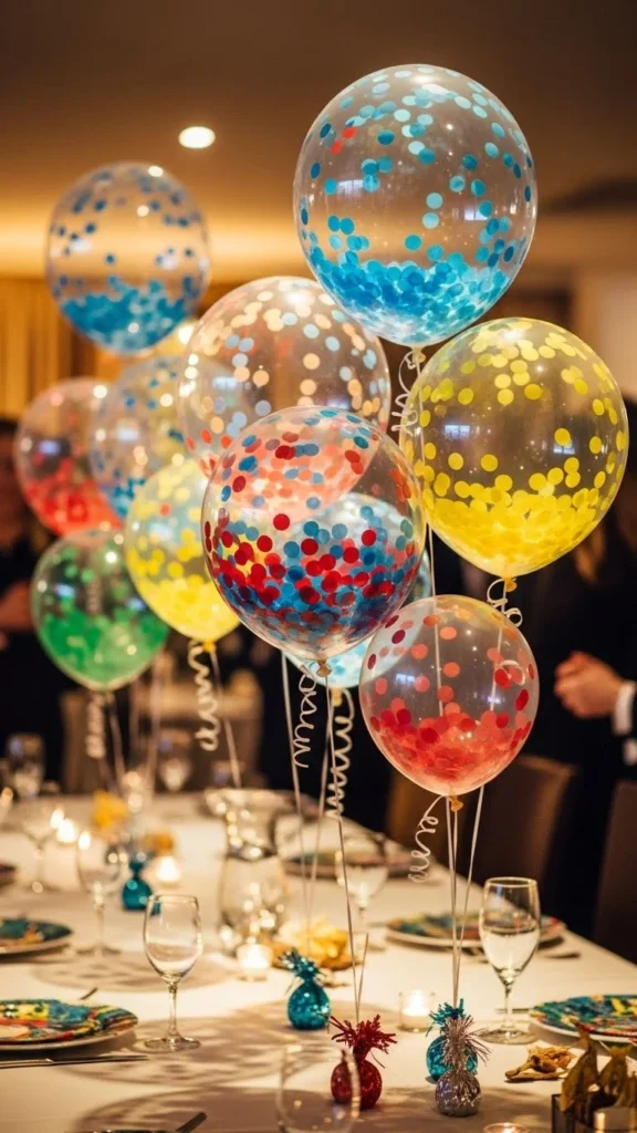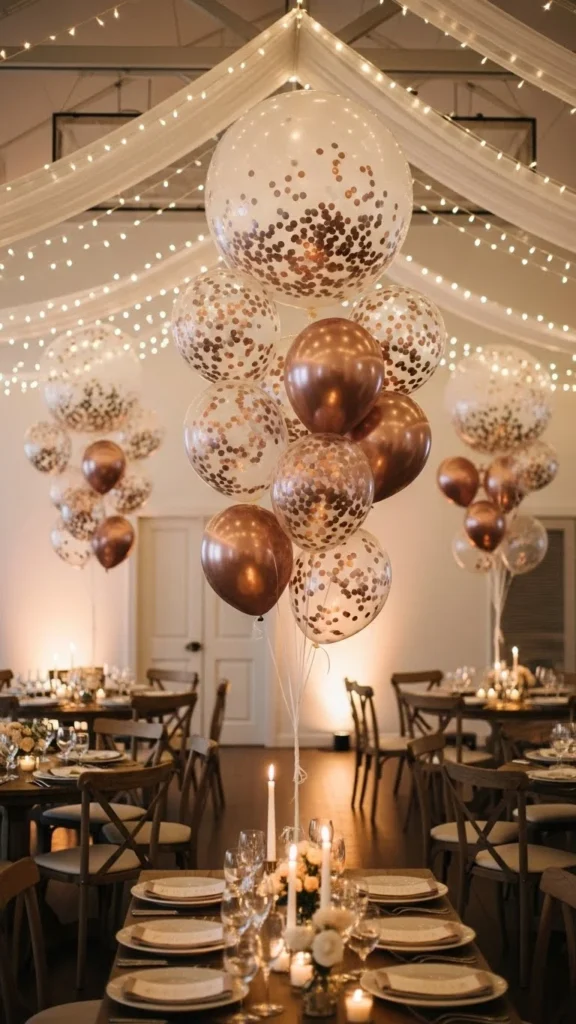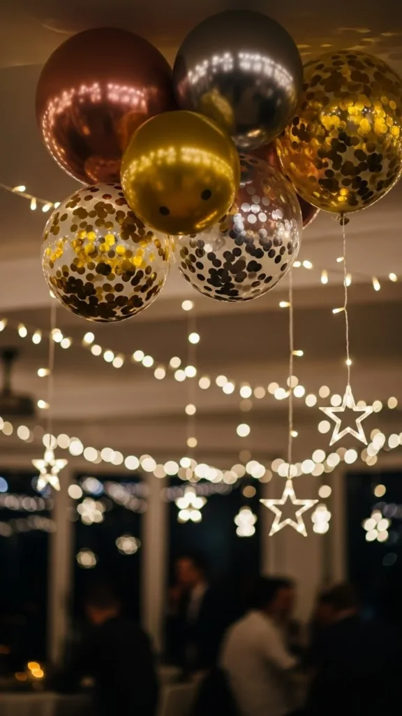 Metallic confetti balloons shine best in evening light. They catch reflections from lamps and string lights, adding depth to the room.