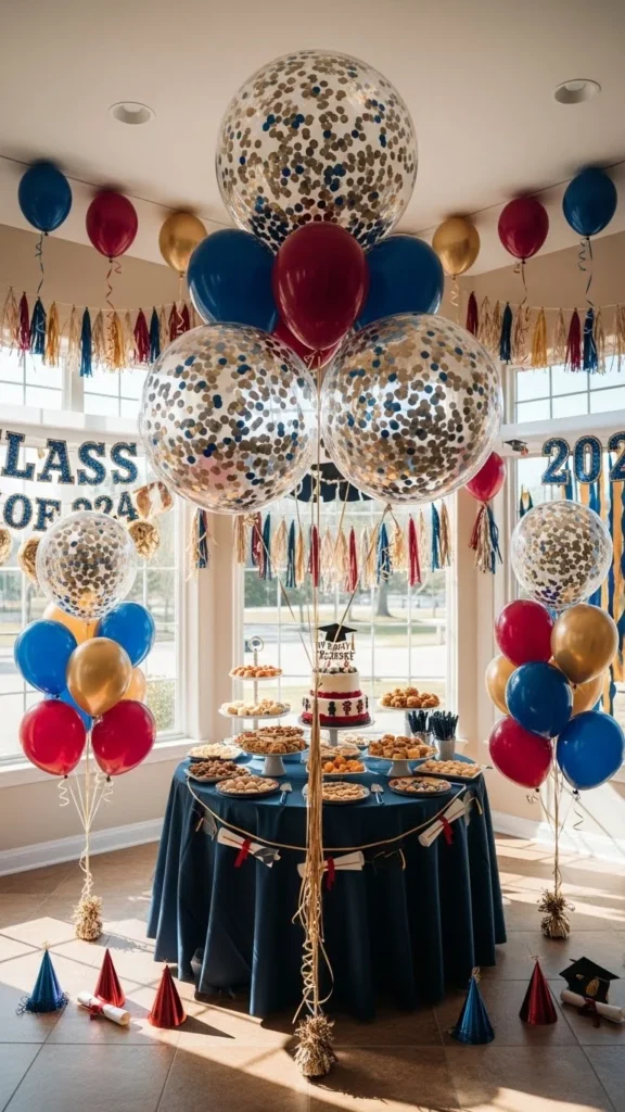 Graduation balloons feel personal when colors match school themes. Use paper confetti in two shades only.