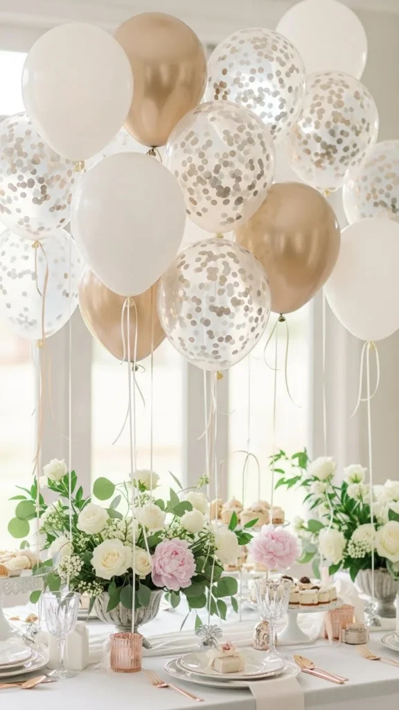 Neutral confetti balloons suit bridal showers well. Use beige, blush, or ivory shades.