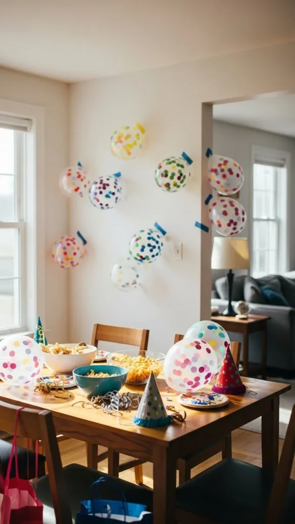 DIY confetti reduces cost, especially for larger parties. Use air-filled balloons taped to walls or furniture.
