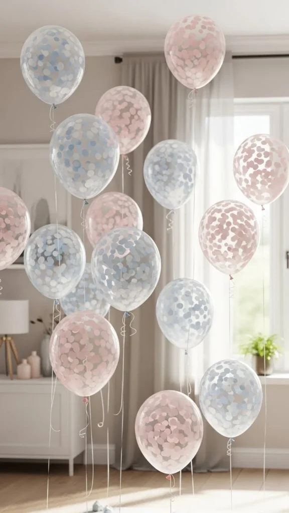Pastel confetti balloons work well for baby showers because they feel gentle and welcoming. Colors like blush, mint, lavender, and soft yellow photograph nicely in natural light.