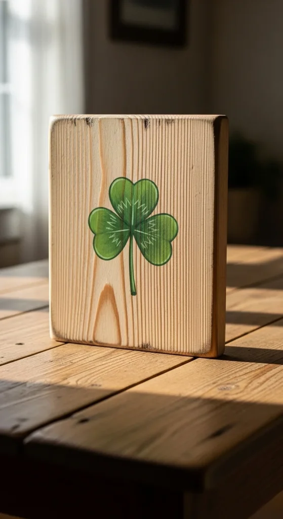 Start with a scrap wood board or an inexpensive craft plank. Lightly sand the surface and wipe it clean. Sketch a basic three-leaf clover with pencil. Fill it in using green acrylic paint, leaving some wood grain visible for character. Allow it to dry fully before applying a clear matte sealant.