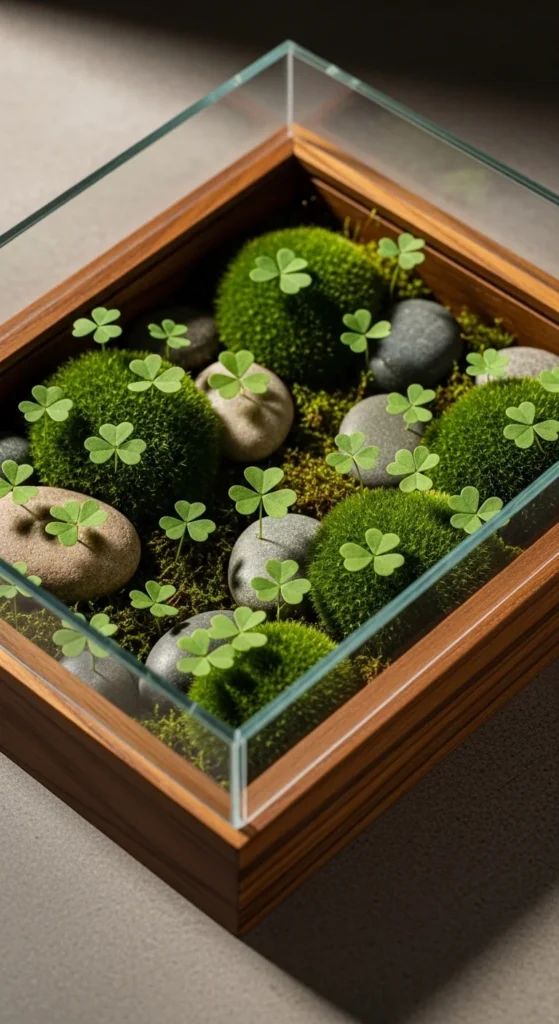 Layer faux moss, pebbles, and wooden clover cutouts inside a shadow box.