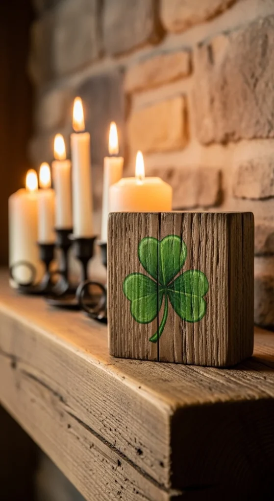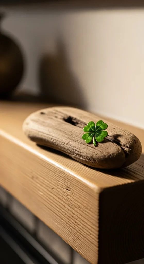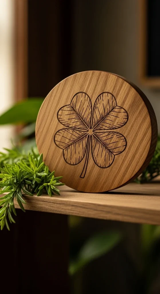 A hand-painted wooden clover plaque feels warm and personal. It mirrors the type of handmade décor often found in traditional rural homes. The beauty lies in visible brush strokes and natural wood texture rather than perfect lines.