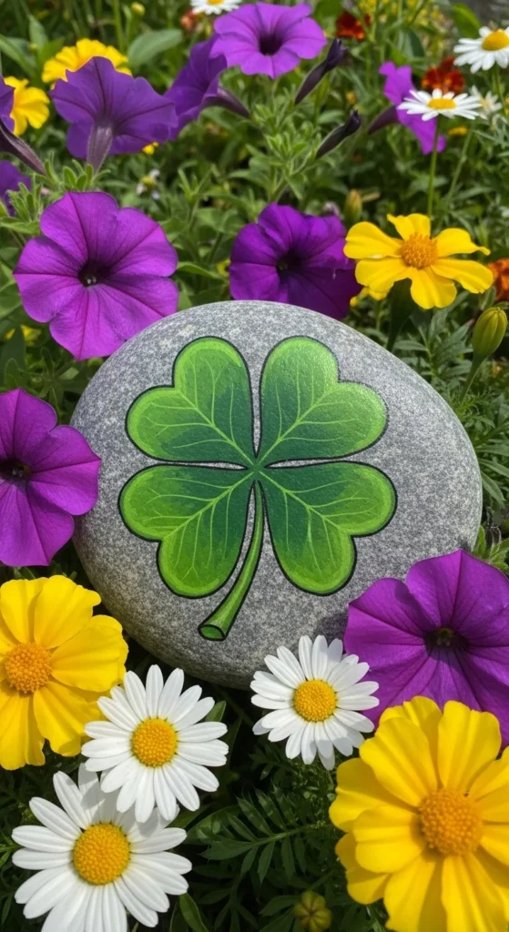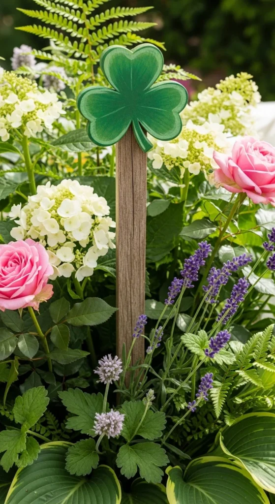 Paint clovers on flat stones using outdoor paint. Scatter throughout flower beds.