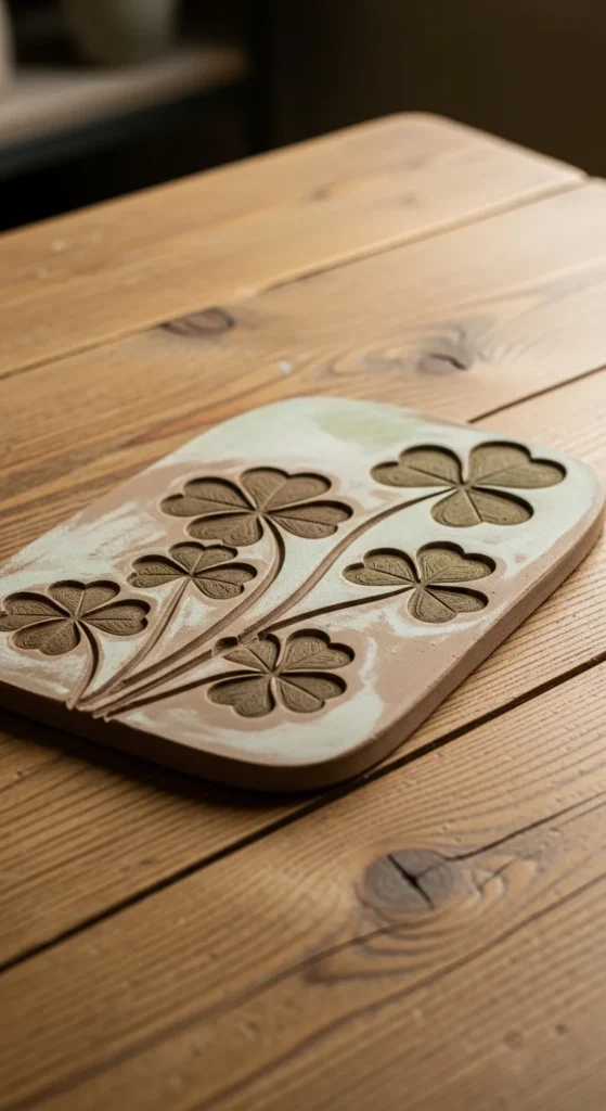 Use air-dry clay or concrete mix poured into a shallow mold. Before it sets, press a clover stencil into the surface. Let it cure fully and brush away loose dust.