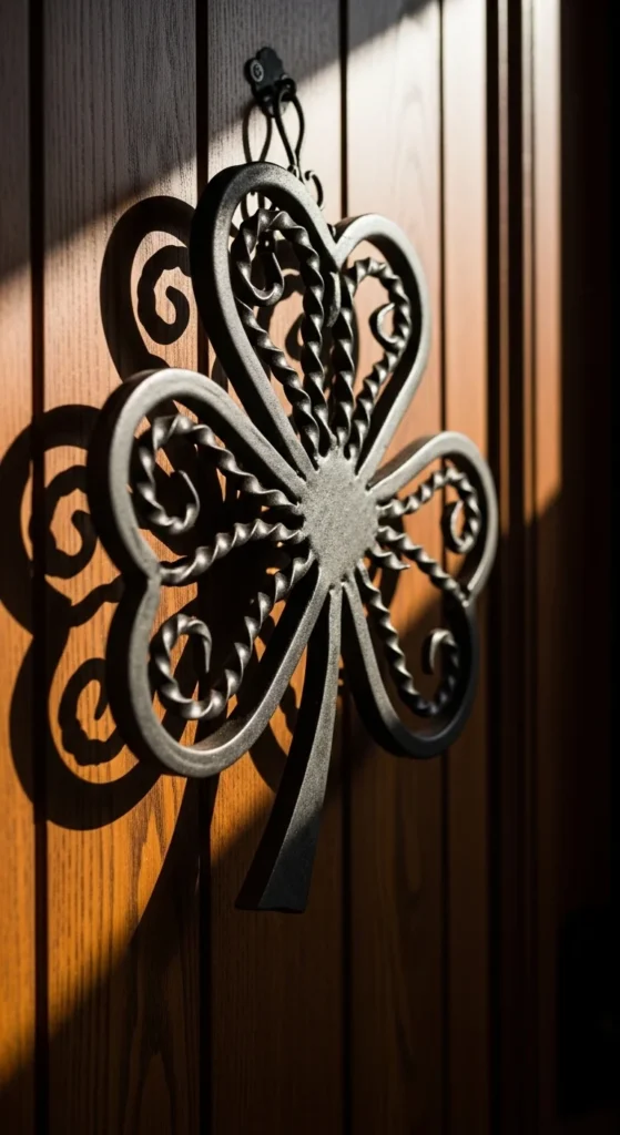 A wrought iron clover adds weight and durability. It echoes traditional metalwork seen in old villages.