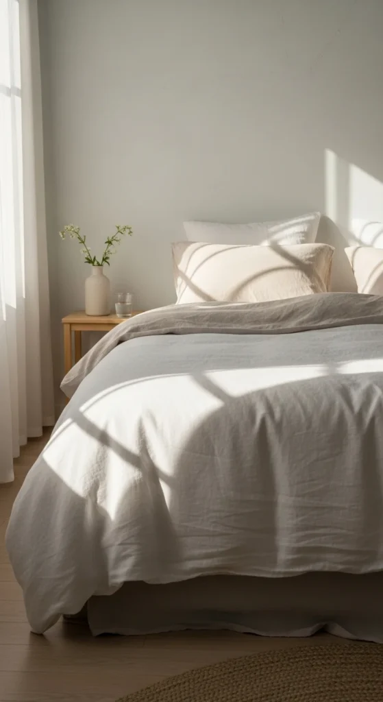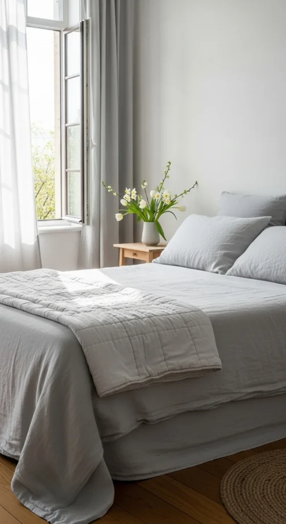 Switching to light cotton bedding helps a bedroom feel calmer right away. Cotton allows airflow and feels comfortable for changing spring temperatures. Soft neutral shades such as white, sand, or pale gray reflect daylight and keep the room visually open.
