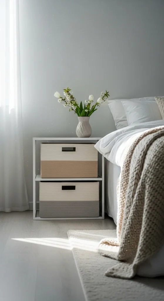 Storage near the bed helps reduce clutter. Neutral baskets or boxes blend into the room rather than standing out.