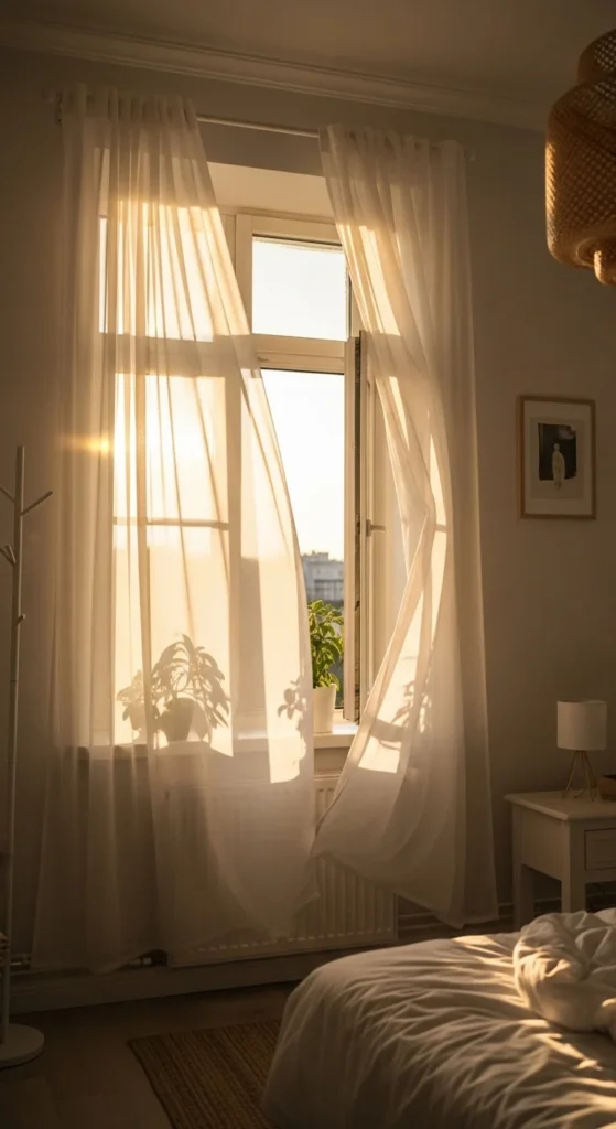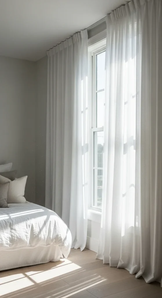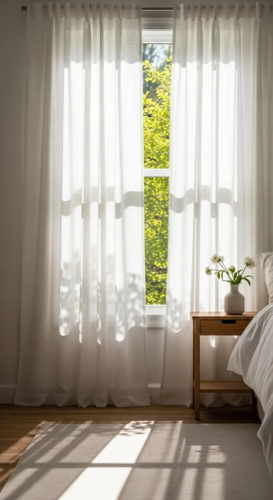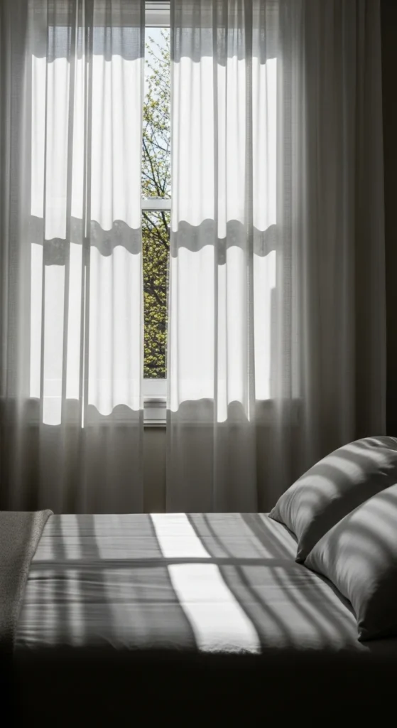 Heavy curtains can make bedrooms feel closed off as daylight increases. Sheer panels allow light to pass through while still offering privacy. This helps the room feel open during the day and gentle in the evening.