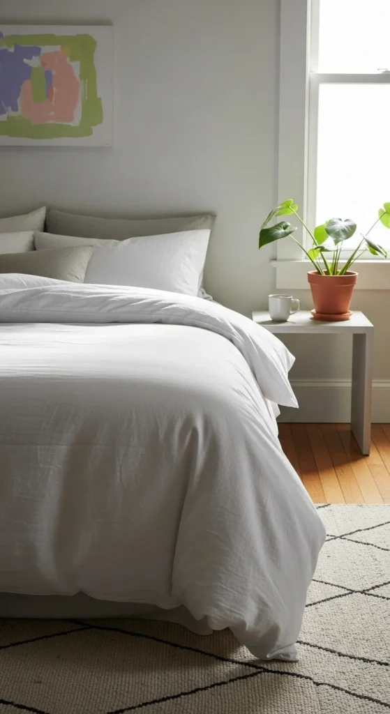 You do not need an expensive bedding set. Flat sheets can double as lightweight duvet covers when folded neatly. Mixing similar tones keeps the bed from looking busy. Washing bedding regularly also helps maintain that clean, inviting look.