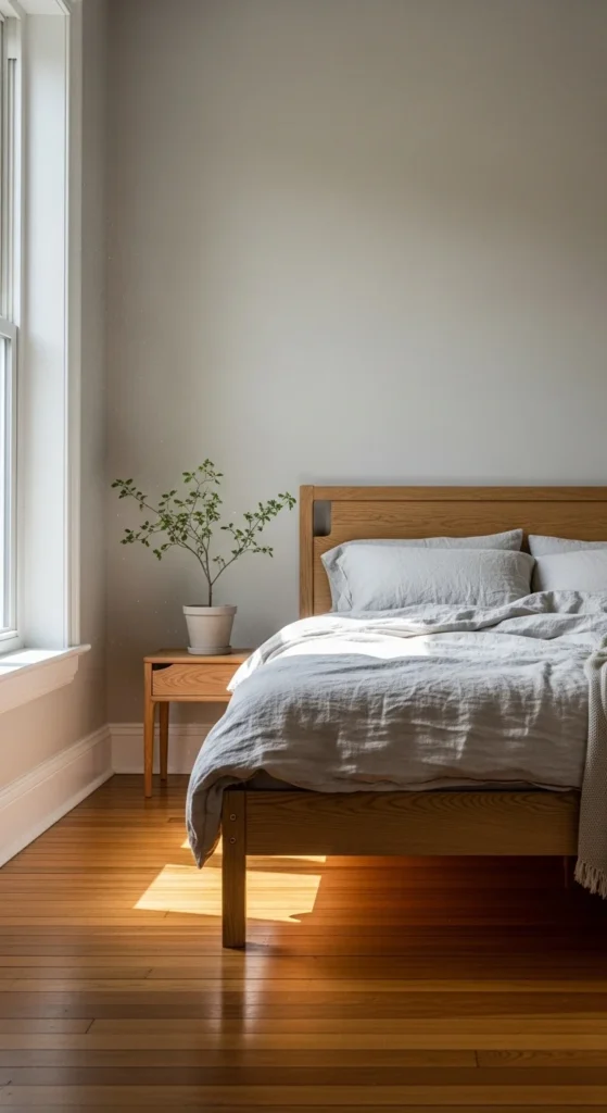 Simple bed frames help keep focus on rest. Wood or metal in neutral tones works well.