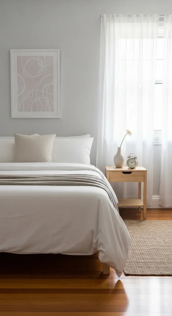 Items on the floor disrupt visual calm. Clearing clothes, bags, and shoes makes the room feel more restful.