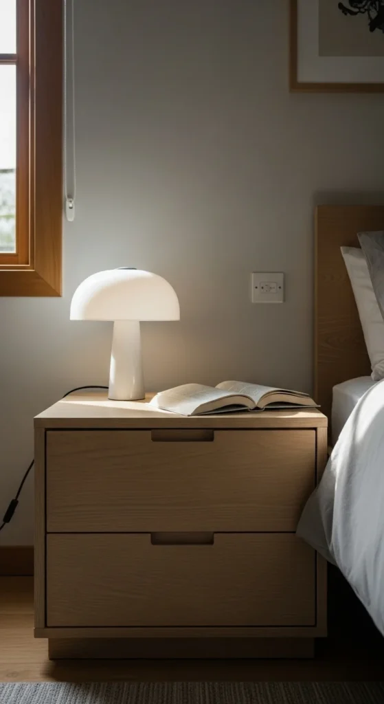 Keeping bedside tables simple supports relaxation. Avoid stacking items.